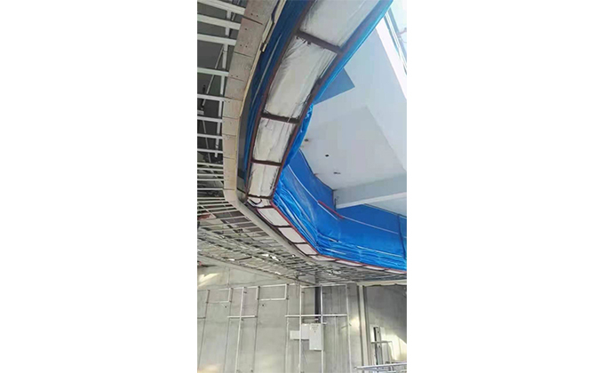 擋煙垂簾垂壁根據(jù)設(shè)計(jì)要求和現(xiàn)場(chǎng)實(shí)際情況采取如下施工順序:首先,搭設(shè)腳手架一放線(xiàn)一打眼--上脹栓一焊骨架。第二,吊件一安裝骨架…